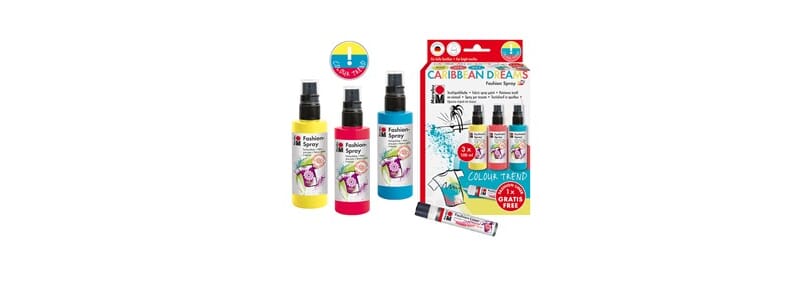 Tekstilfarge på spray - fikserbar. Set med 3 x 100 ml sprayflasker + 1 Fashion Liner (020 lemon/ 212 flamingo/ 091 caribbean blue + liner shimmer 25 ml)
