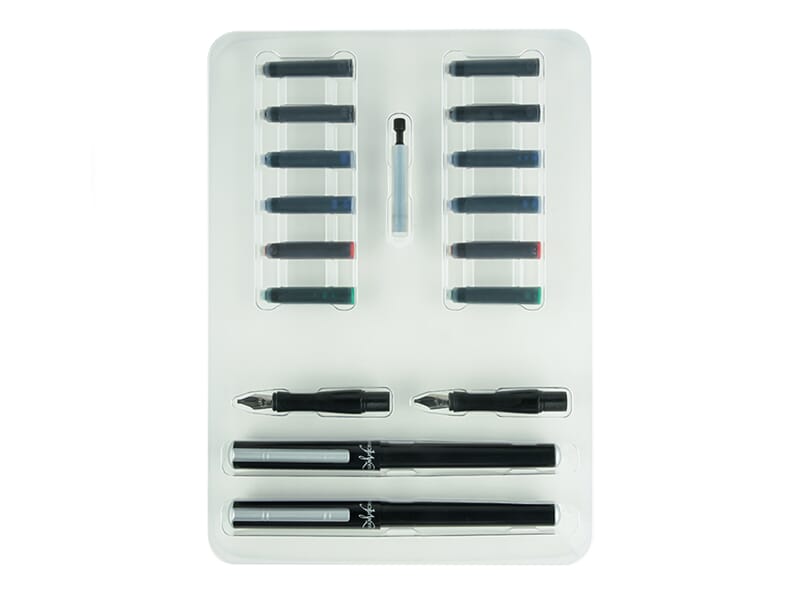 Fint gavesett med 2 fyllepenner og 4 splitter (medium, 2B, 4B og scroll 6), øvingsbok med instruksjoner og 12 blekkpatroner i assorterte farger
