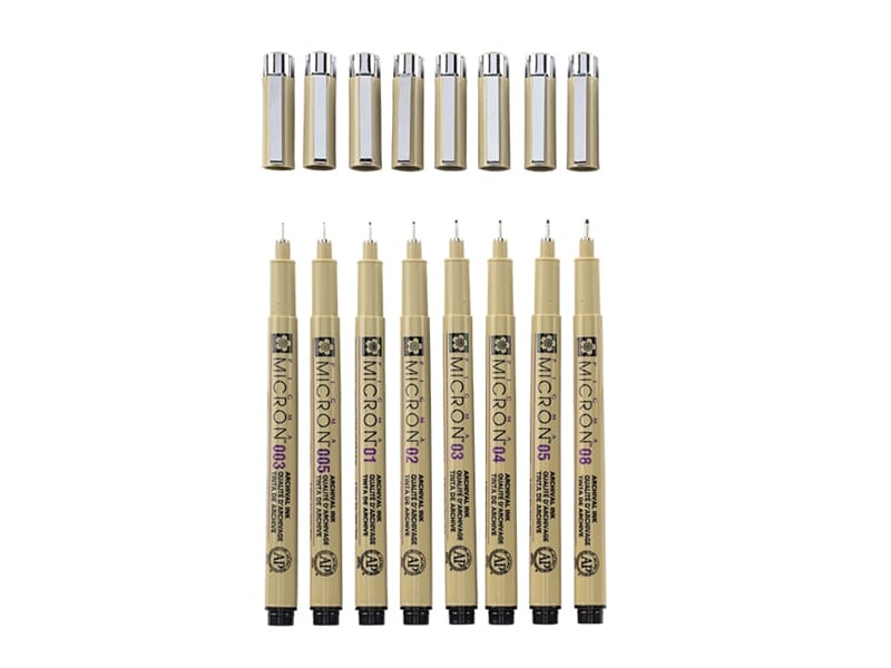 Pigma var den første «fine-lineren» til skrift og tegning, som både var vannfast og hadde hurtigtørrende pigment tusj. Tusjen gir et permanent resultat. Lysekte både for sollys og UV lys. Syrefri og motstandsdyktig mot kjemikalier. Velegnet til skrift, tegning og til bruk med bl.a. akvarellfarger. Fester på både papir, tre, stoff og kartong. Meget tynn og presis spiss forsterket med metall. Føres i mange forskjellige strekbredder. Pakken inneholder 8 fineliners, og strekbredder fra 003 (0,15 mm) - 08 (0,5 mm)